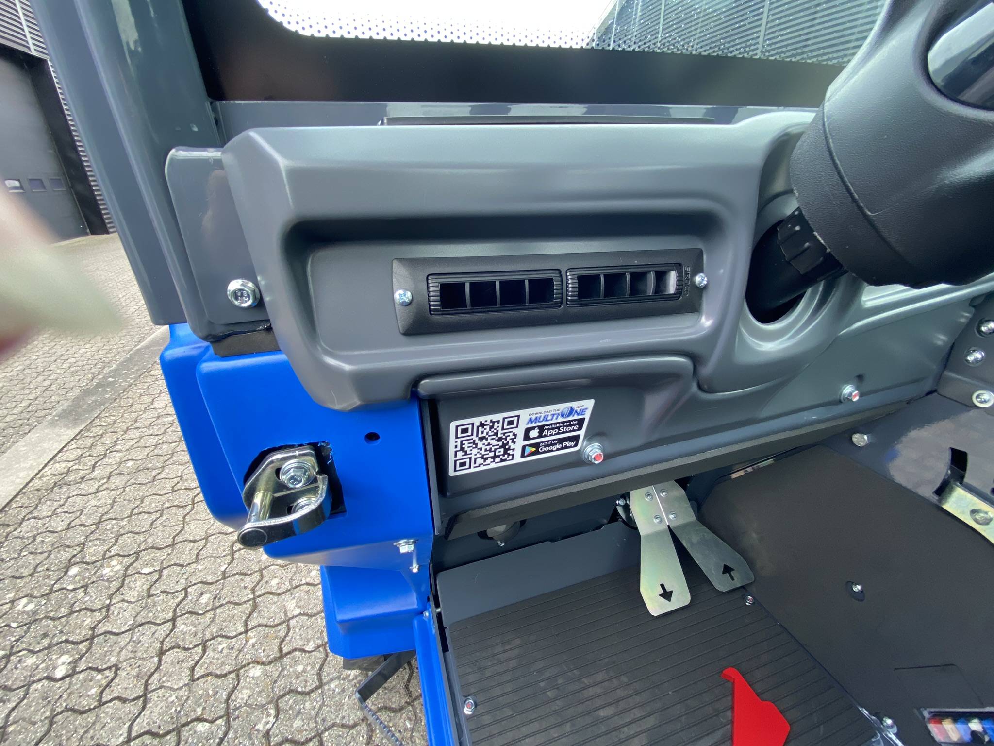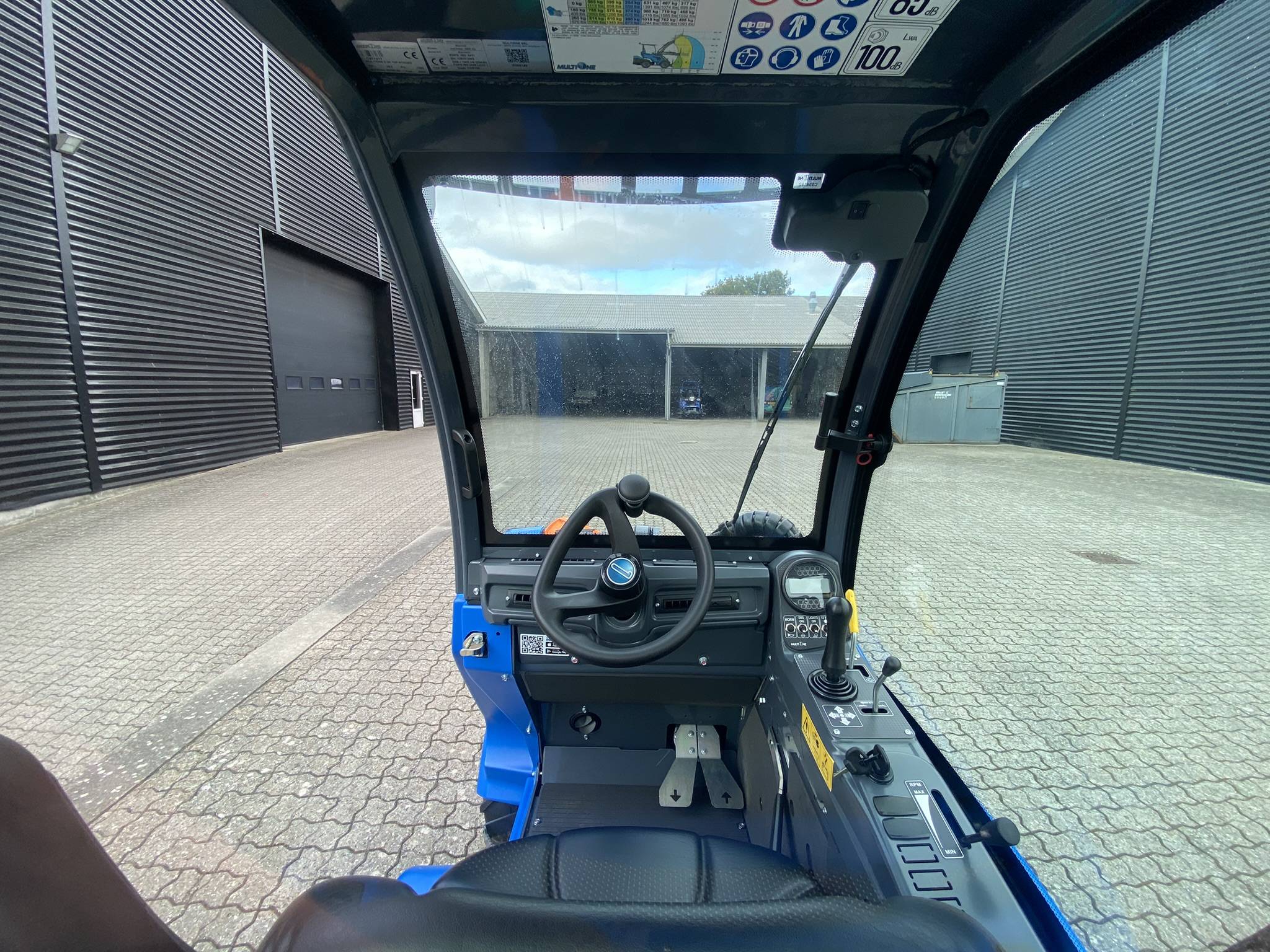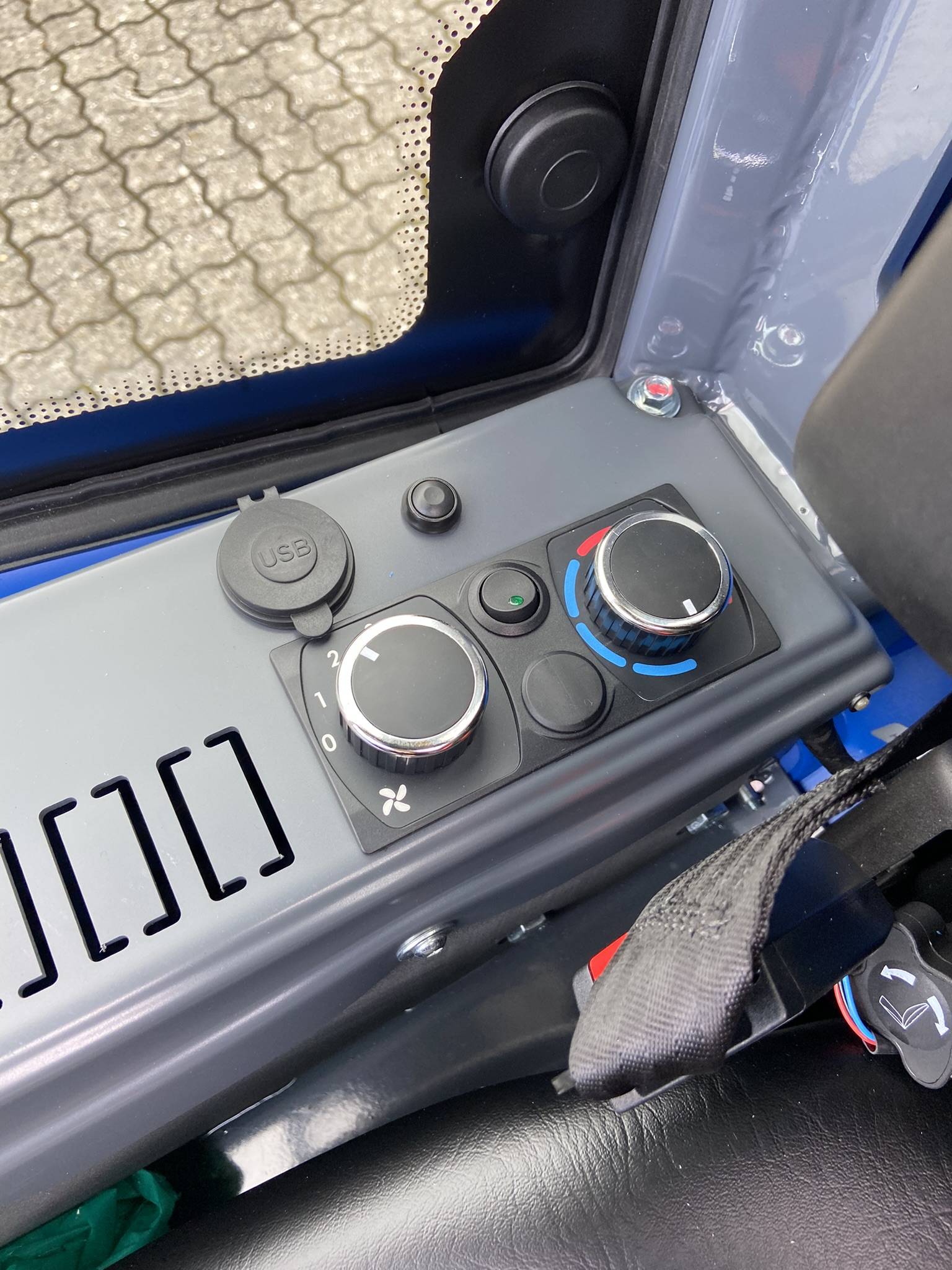 Det primære tilslutningspanel i højre bageste hjørne af kabinen indeholder tilslutningerne til ISOBUS, kamera og strømudtag. Flere USB-ladepunkter, jævnstrømsudtag samt ekstra strømstik er placeret logisk rundt i kabinen. Eksempelvis er der et 12V-udtag ved gaspedalen til den ekstra køleboks.