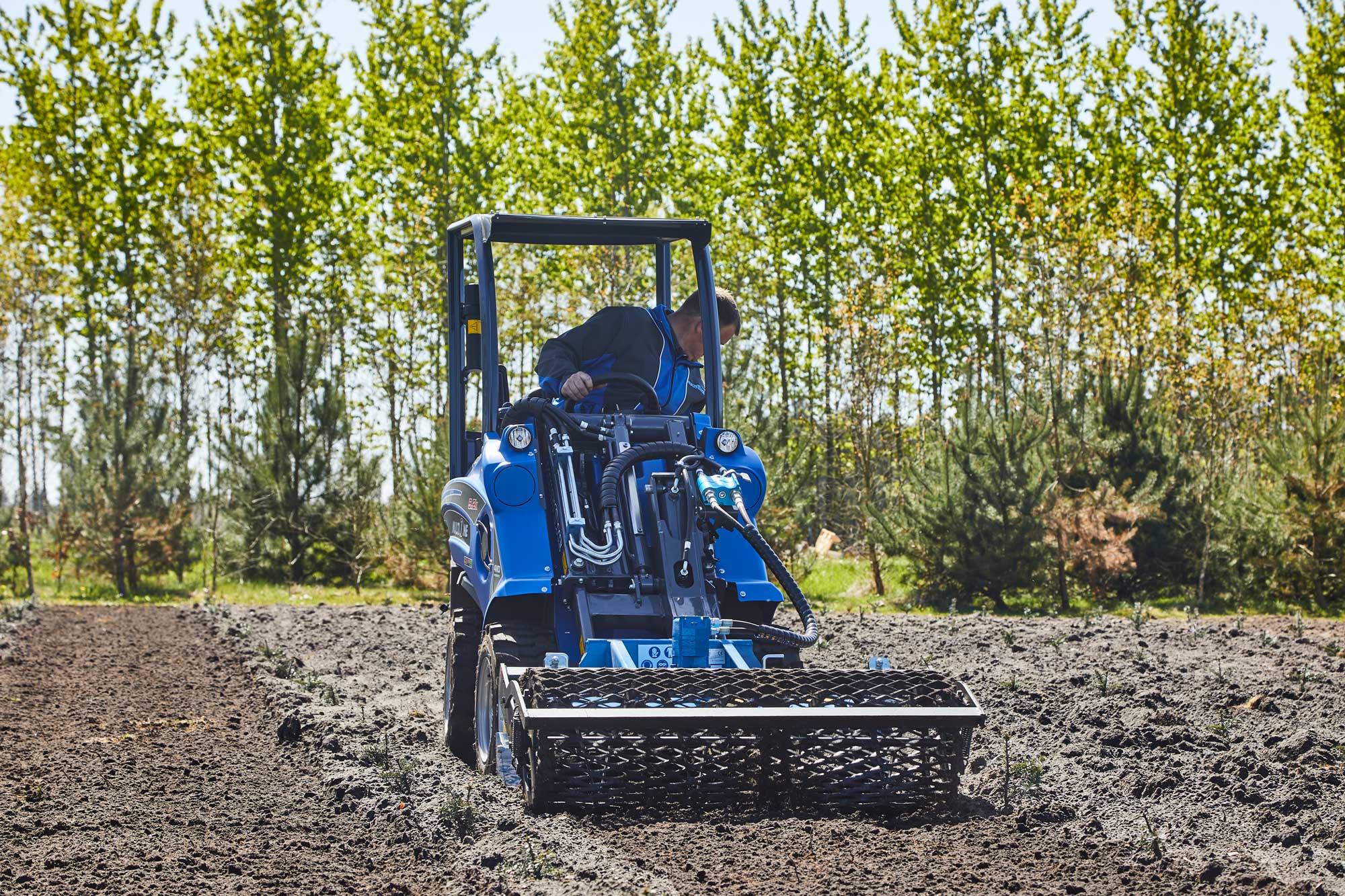 Med en egenvægt tæt på 1.000 kg og en bredde på kun 98 cm, får du her en let maskine med lavt marktryk, som kan komme igennem de fleste smalle passager.