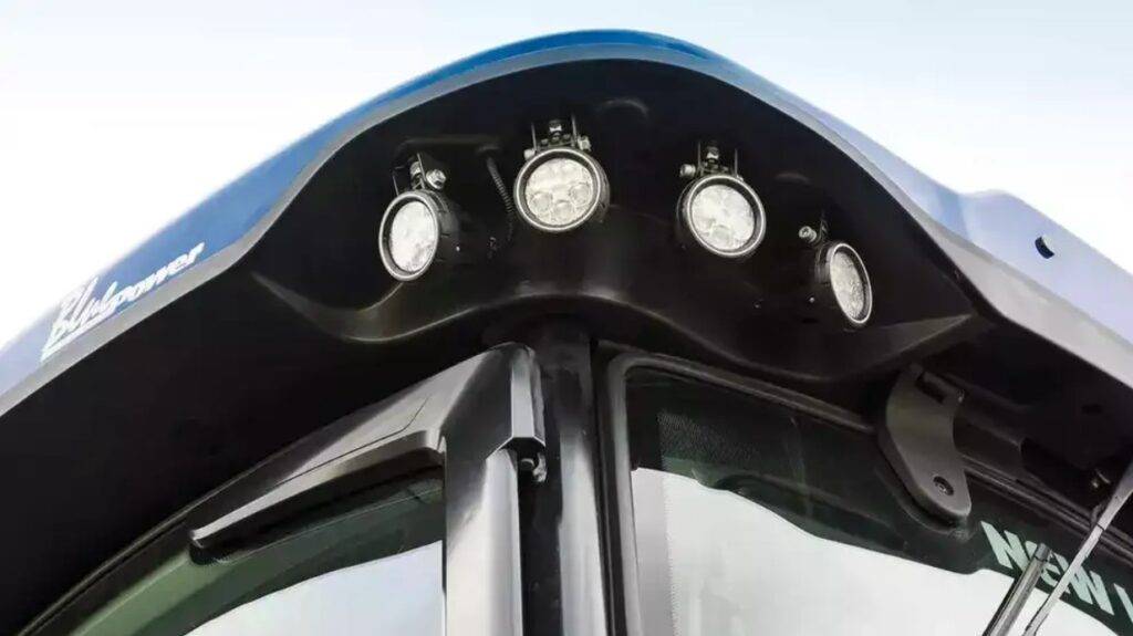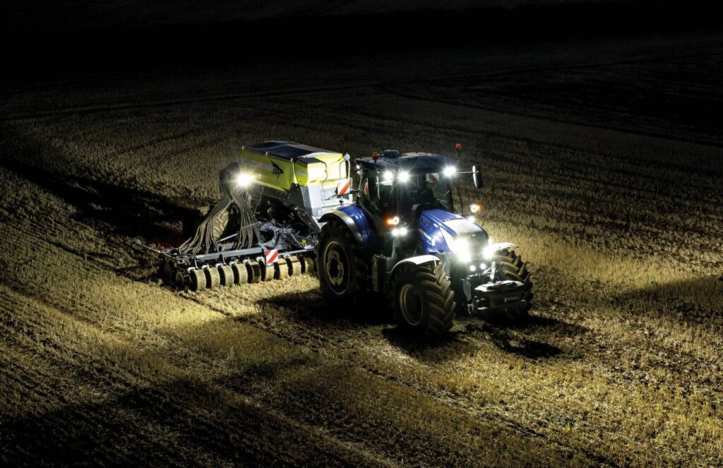 T7 LWB har en imponerende lysstyrke på 45.600 lumen, men det er ikke kun et spørgsmål om at montere flere lygter. Et par af kabinens bageste hjørnelygter er langtrækkende og kan belyse yderpunkterne på et bredt redskab om natten, og over motorhjelmen er der anbragt lignende lygter, der lyser ned på marken.
